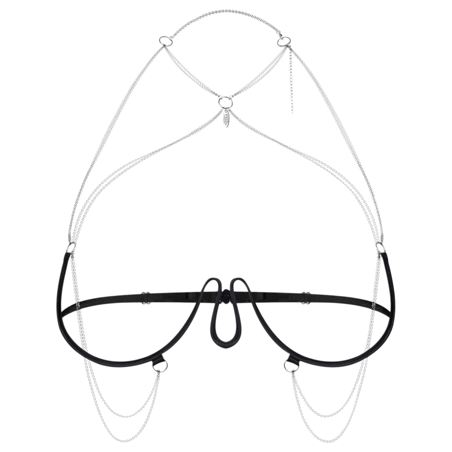 Dette spesielle stykket løfter forførelsen og fremhevelsen av femininitet til et nytt nivå. Den unike åpne cup-designen fremhever brystene, mens kjettinger og smykkelignende dekorasjoner gjør utringningen og området under bysten enda mer spennende. Perfekt valg for spesielle anledninger, eller hvis du vil overraske partneren din - eller deg selv - med et virkelig dristig, luksuriøst undertøy.