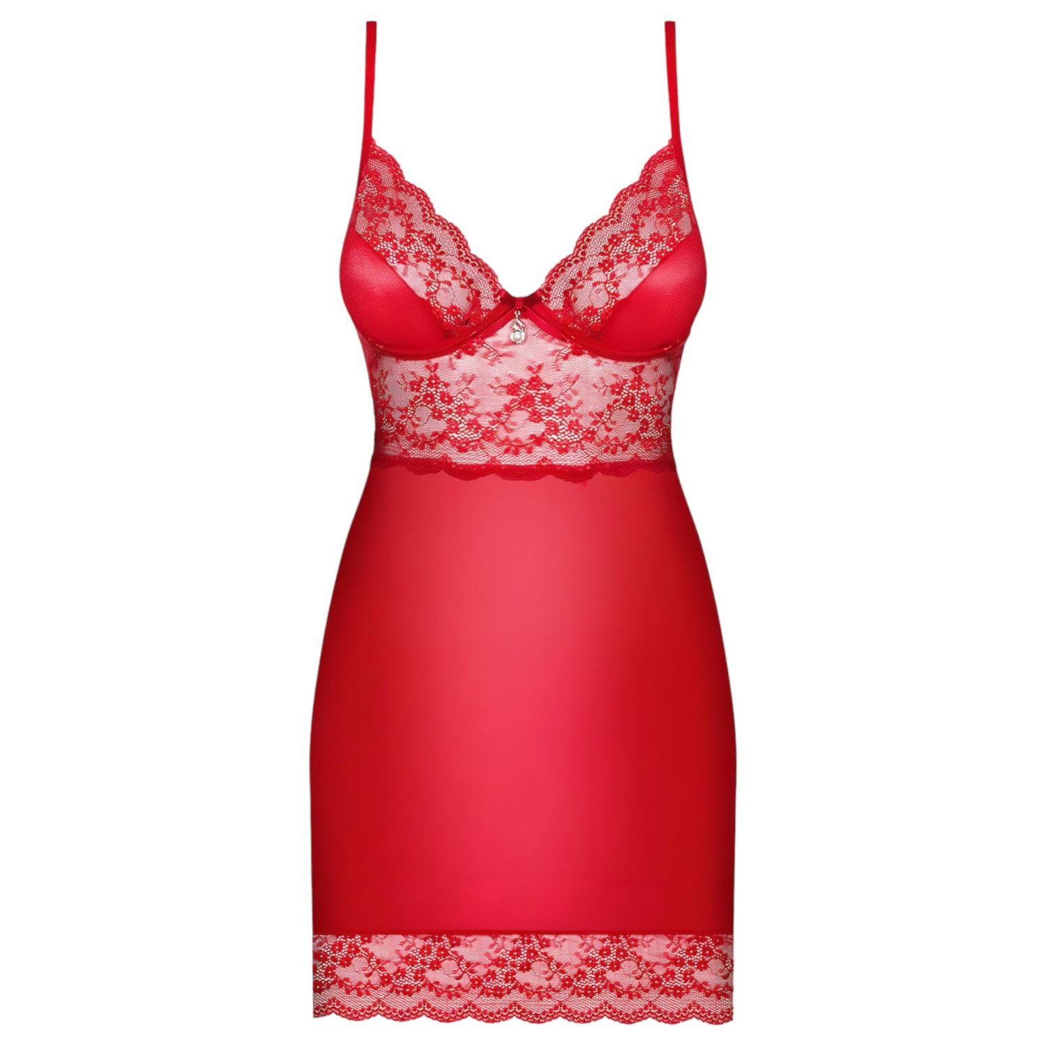 • 1 stk rød nattkjole med forsterket byste, justerbare stropper, gjennomsiktige blondeinnlegg og hvit perlepynt