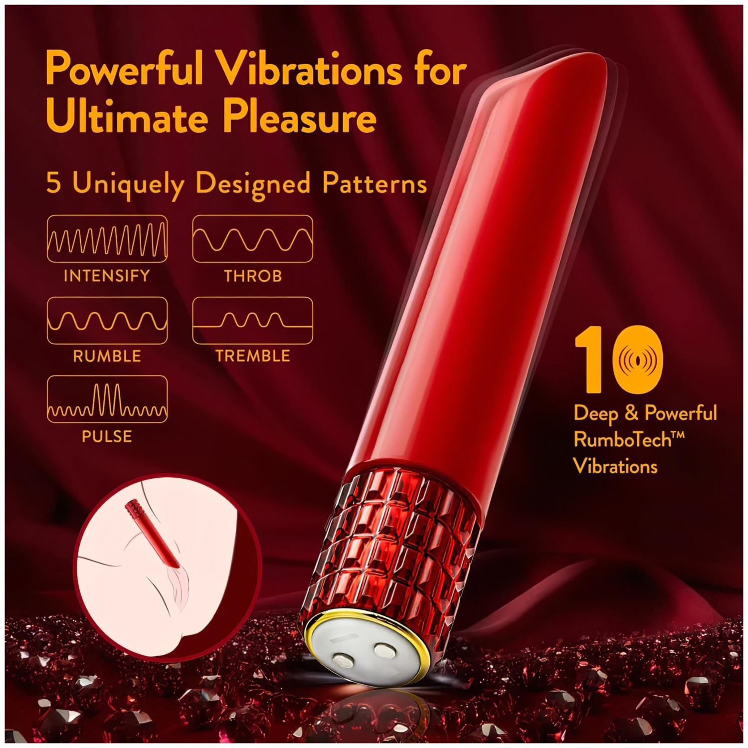 Oh My Gem Desire er ikke bare en luksuriøst utseende vibrator, men også en nytelsesforsterker som skjemmer bort med kraften fra RumboTech™ motor og 10 varierte vibrasjonsmoduser. Den kompakte størrelsen gjør at du kan ta den med deg overalt, og takket være vanntettheten kan du også nyte den i badeværelset. Oppvarmingsfunksjonen gir en enda mer intim opplevelse, mens kroppssikre materialer sørger for maksimal komfort og sikkerhet.
