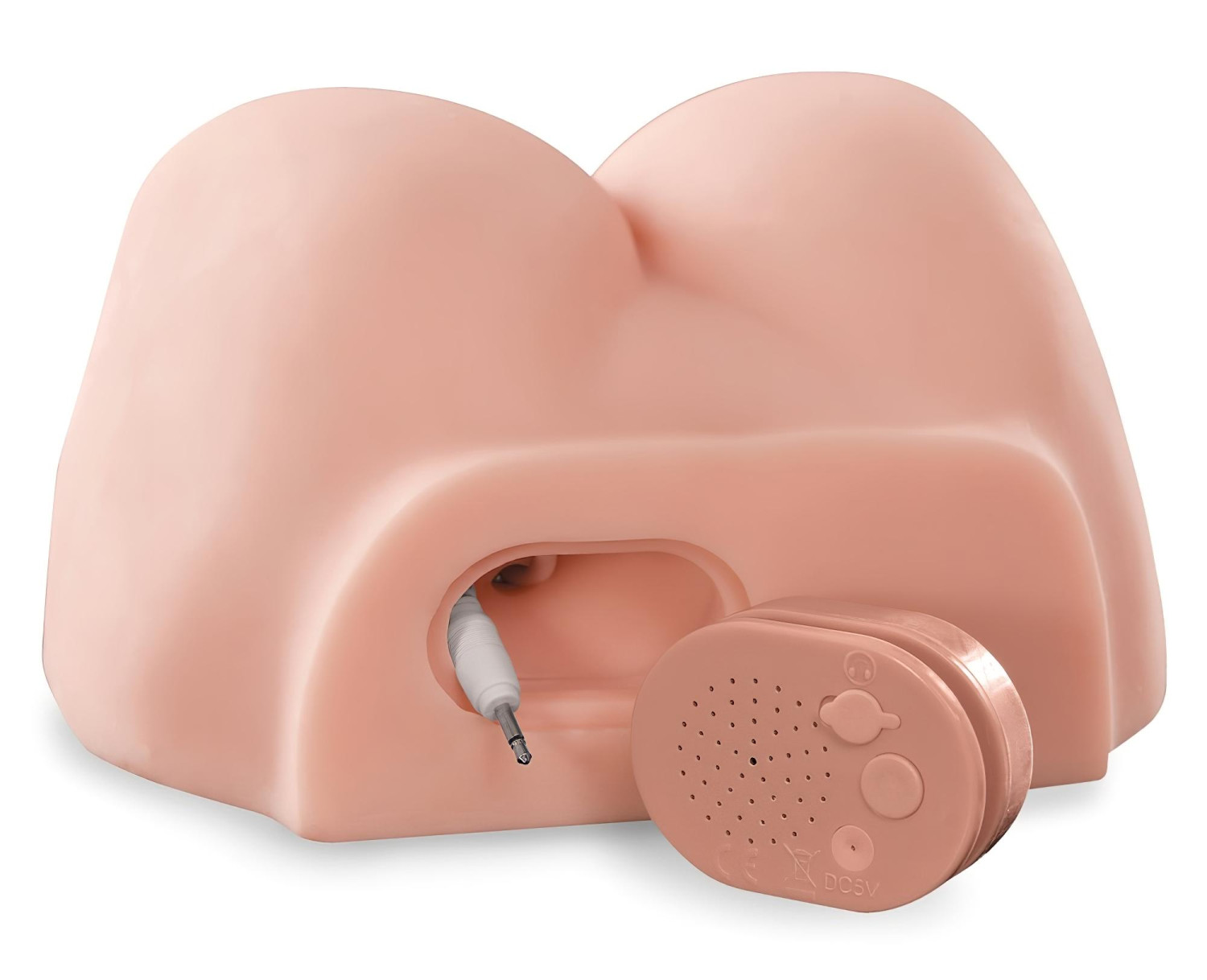 Kontrolleren er på motsatt side av penis. Trekk forsiktig ut kontrolleren med høyttaleren og koble til kabelen i masturbatoren. Hold nede knappen på kontrolleren for å aktivere vibrasjons- og stønnfunksjonen.
