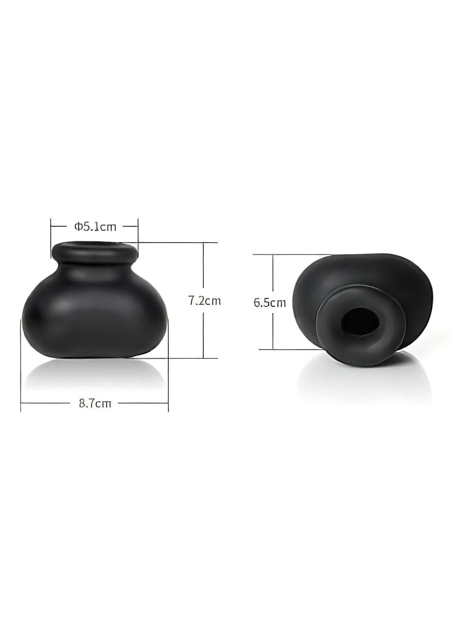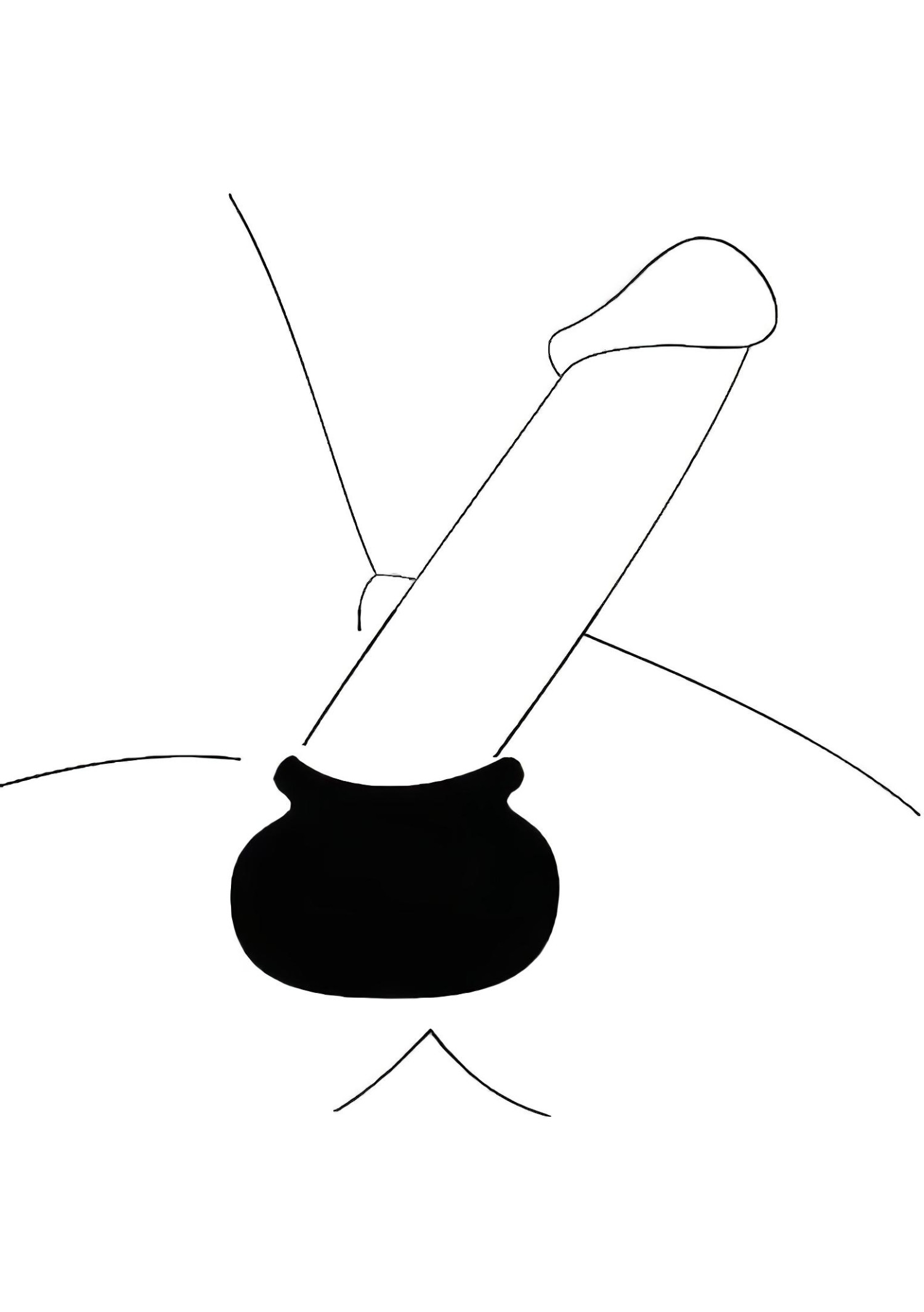 For å sette på, stretch åpningen – for eksempel med to fingre eller ved kanten – og trekk forsiktig over hele pungen, til den sitter godt. Takket være muggeformen gir den en lett klem, men behagelig følelse, mens den trekker testiklene nedover.
