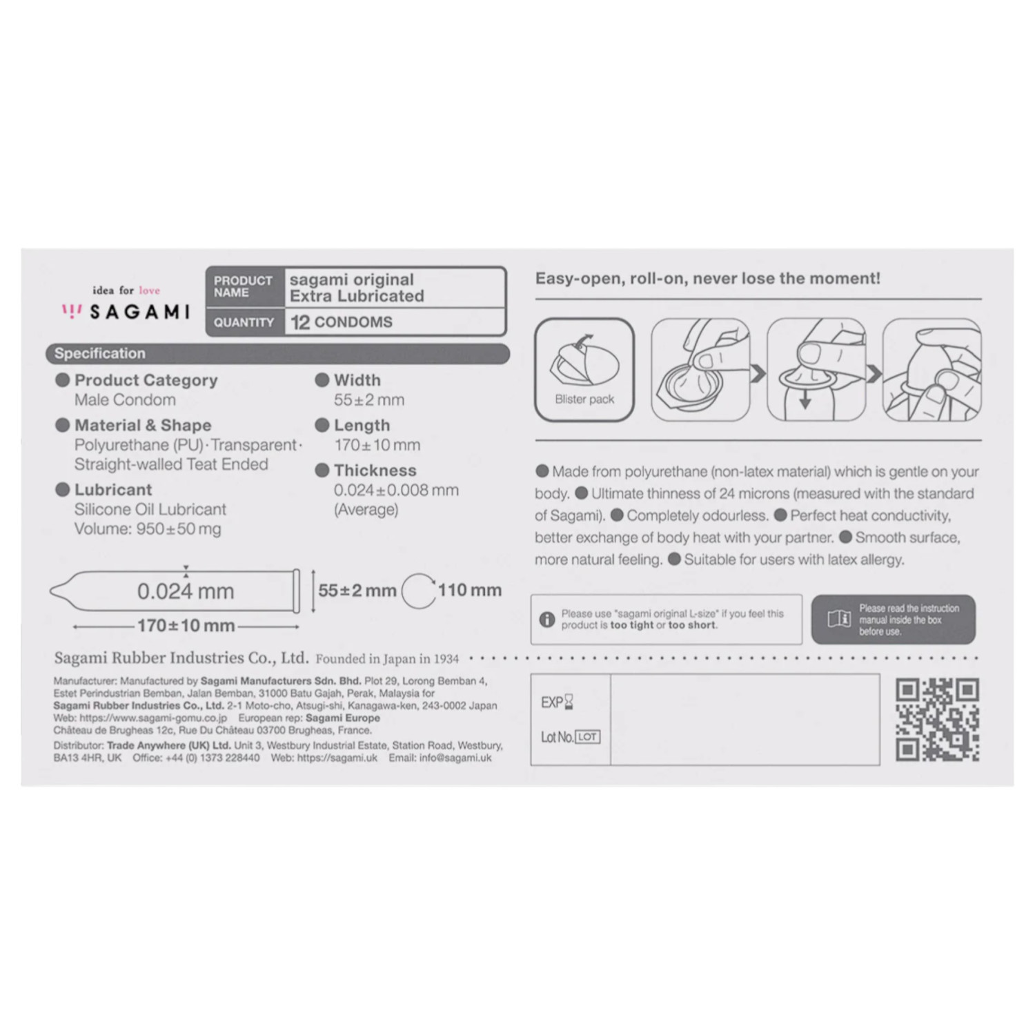 I over 90 år har Sagami utviklet kondomer av topp kvalitet, med målsetningen om ikke bare å tilby sikkerhet, men også å øke intimiteten. Kondomene er laget av polyuretan, noe som gjør dem luktfrie og lateksfrie, og sikrer en mer naturlig opplevelse på grunn av deres utmerkede varmeledningsevne. Det ekstra glidemiddelet gjør samværet enda glattere og mer behagelig.