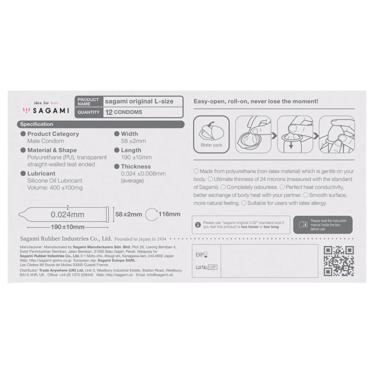Sagami Original L er laget for menn med over gjennomsnittlig størrelse, som ikke vil gå på kompromiss med følsomhet eller sikkerhet. Bredden på 58 mm er perfekt når tradisjonelle kondomer er for stramme. Det lateksfrie materialet gir en mer naturlig følelse ved berøring.