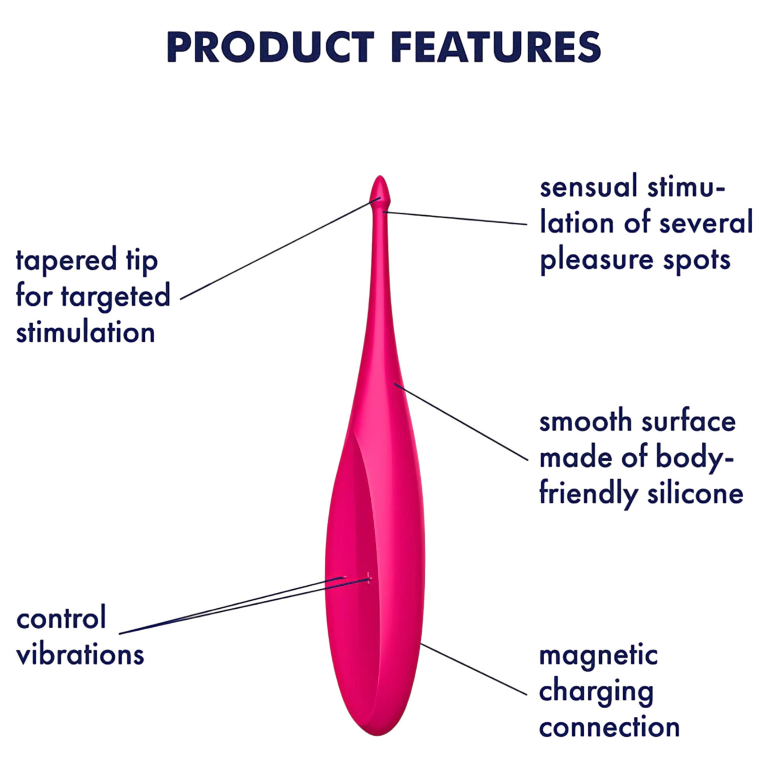 • Liten overflate gir presis stimulering og tilgang til klitoris og urinrøret samt andre intime områder.
