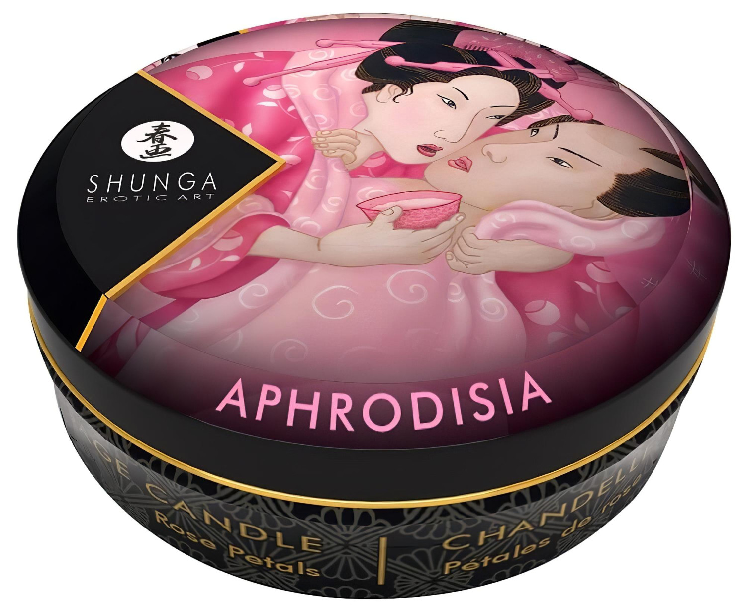 • 1 stk Shunga massasjeolje lys med roseduft, i 30 ml resirkulerbar metalldåse.