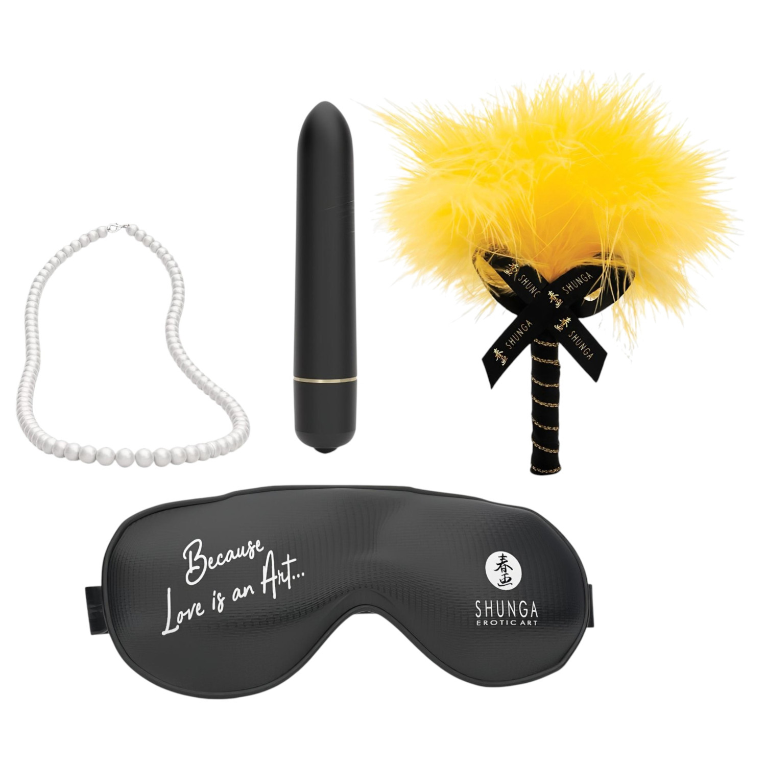• 4 lekent tilbehør – mini vibrator, perlekjede, øyemaske og fjær for spennende kvelder.