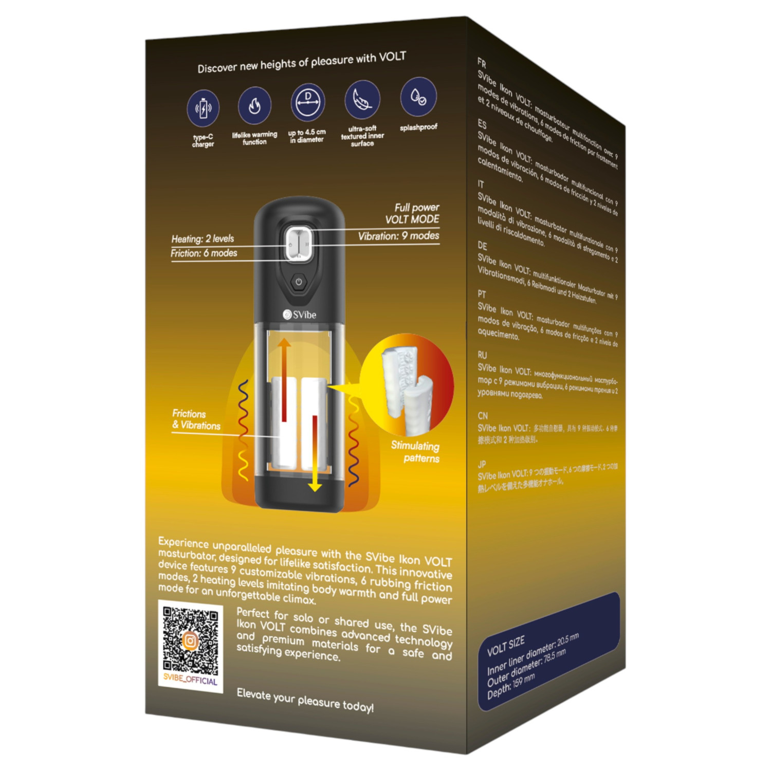 Snail Vibe Ikon Volt er en innovativ, fullstendig automatisk masturbator som tilbyr tre typer stimulering: vibrasjon, massasje og oppvarming. Enheten har et diskret, moderne design og en brukervennlig form, kombinert med 9 vibrasjonsmoduser og 6 intense massasjeprogrammer som tilfredsstiller hele penis. Den varmefunksjonen når kroppstemperatur i to nivåer, noe som gir en mer realistisk og komfortabel opplevelse. "Full Power"-modus gir maksimal ytelse i klimaksøyeblikket slik at hvert høydepunkt blir mer intens enn noen gang.