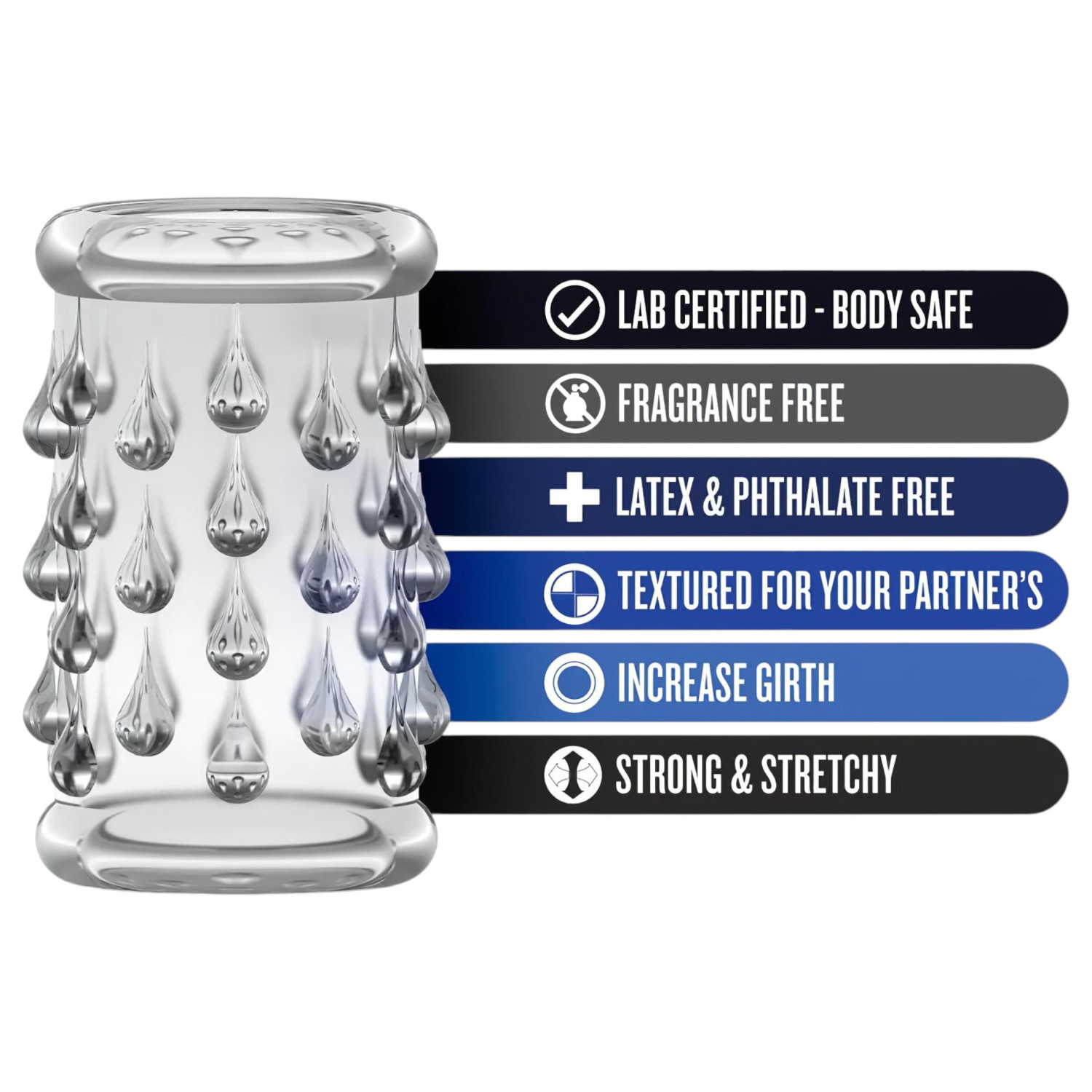 • 1 stykke fleksibelt penismansjett med stimulerende pigger