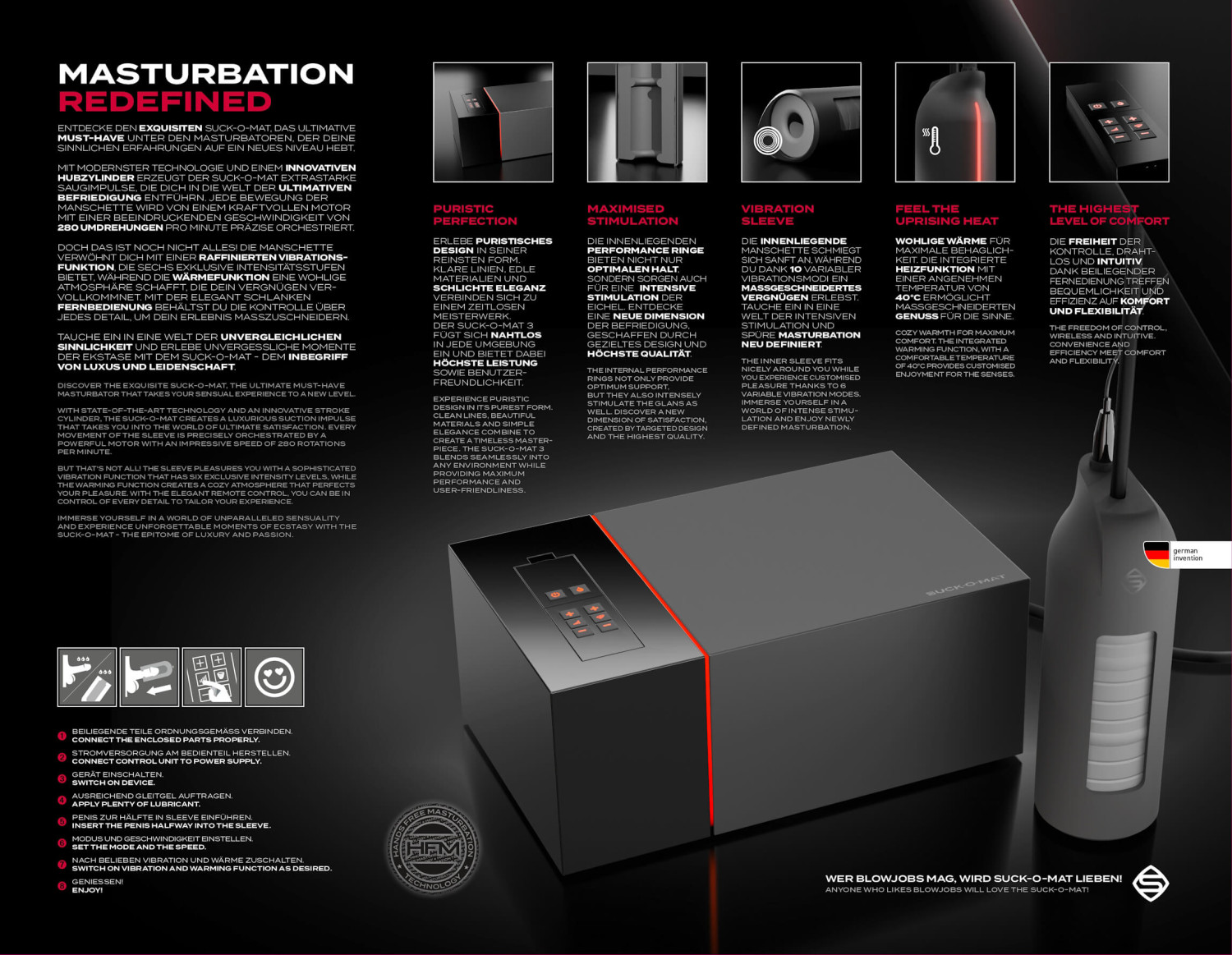 Den Suck-O-Mat 3.0 er en strømtilkoblet, fullautomatisert masturbator som gir en realistisk oral tilfredsstillelse. Sammenlignet med forrige modell har den 100 % større sugekraft og en forbedret motor, med et elegant og sporty design samt LED-belysning.