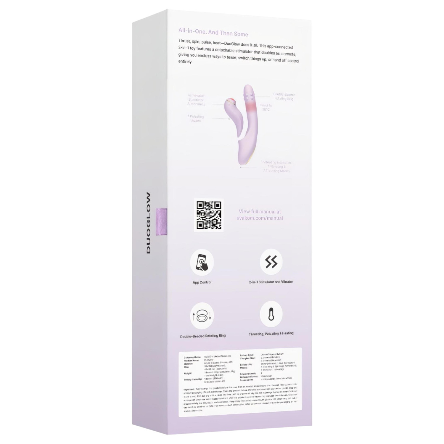 Med DuoGlow kan du virkelig bryte reglene: få pulsende + roterende perler for G-punktstimulering, kraftig vibrasjon, pulserende klitorisstimulering og en varmefunksjon i én enhet. I tillegg gir smart kontroll nesten uendelige muligheter for å skape opplevelser – alene eller i par.