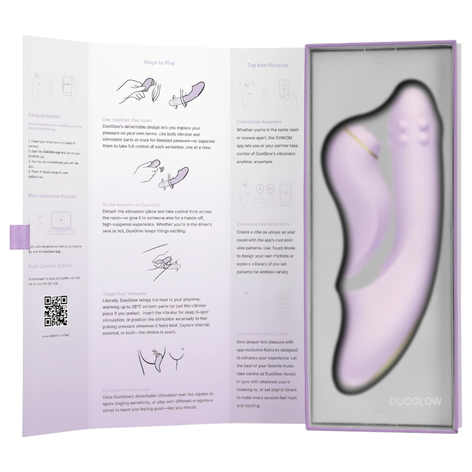 SVAKOM DuoGlow er en 5-i-1 smart G-punkt vibrator og pulserende klitorisstimulator i to deler, som kan brukes sammen i "duett" eller hver for seg – slik at den avtakbare stimulatoren fungerer som en trådløs fjernkontroll.