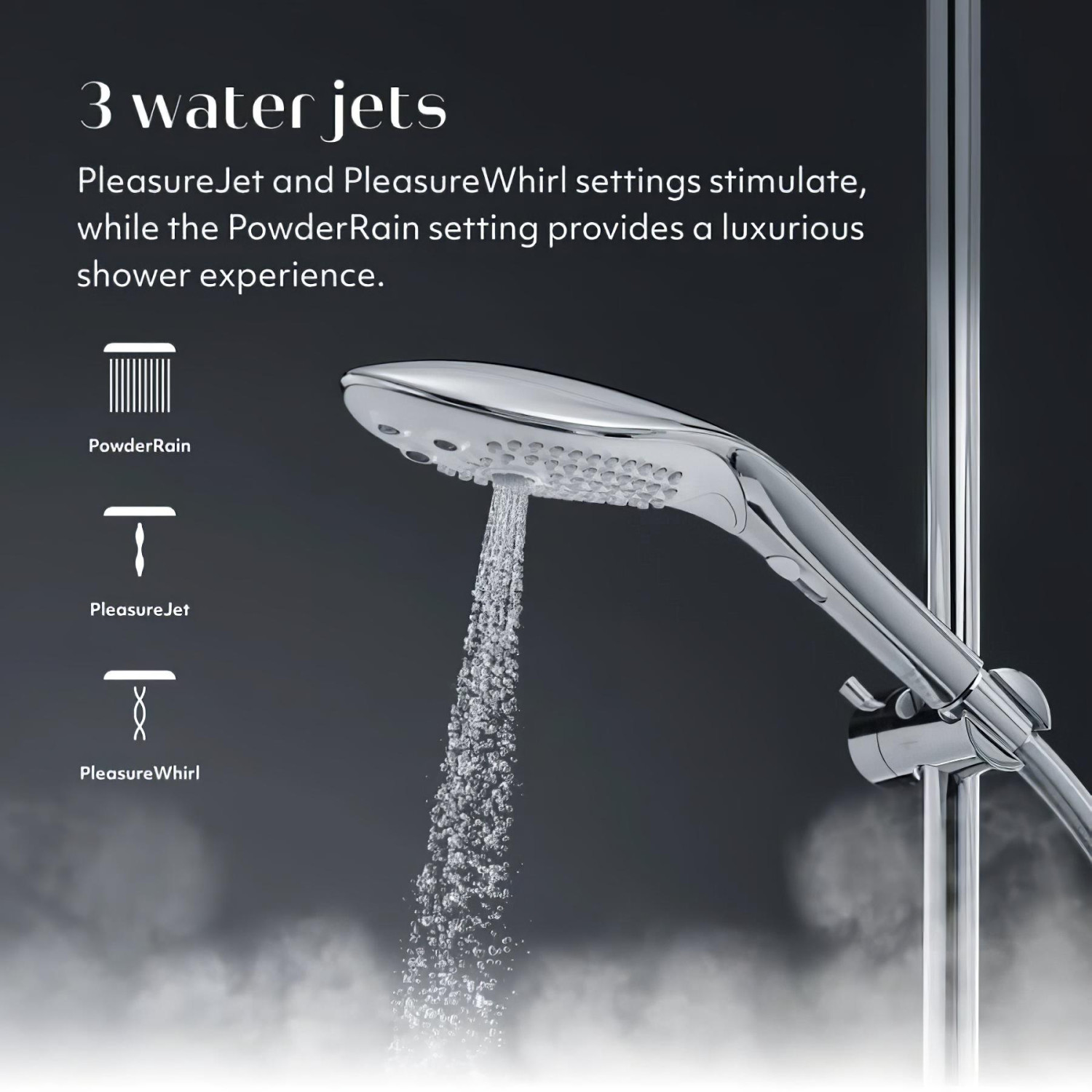 • Pleasure Jet: aktiver den sterke og målrettede vannstrålen i midten av hodet