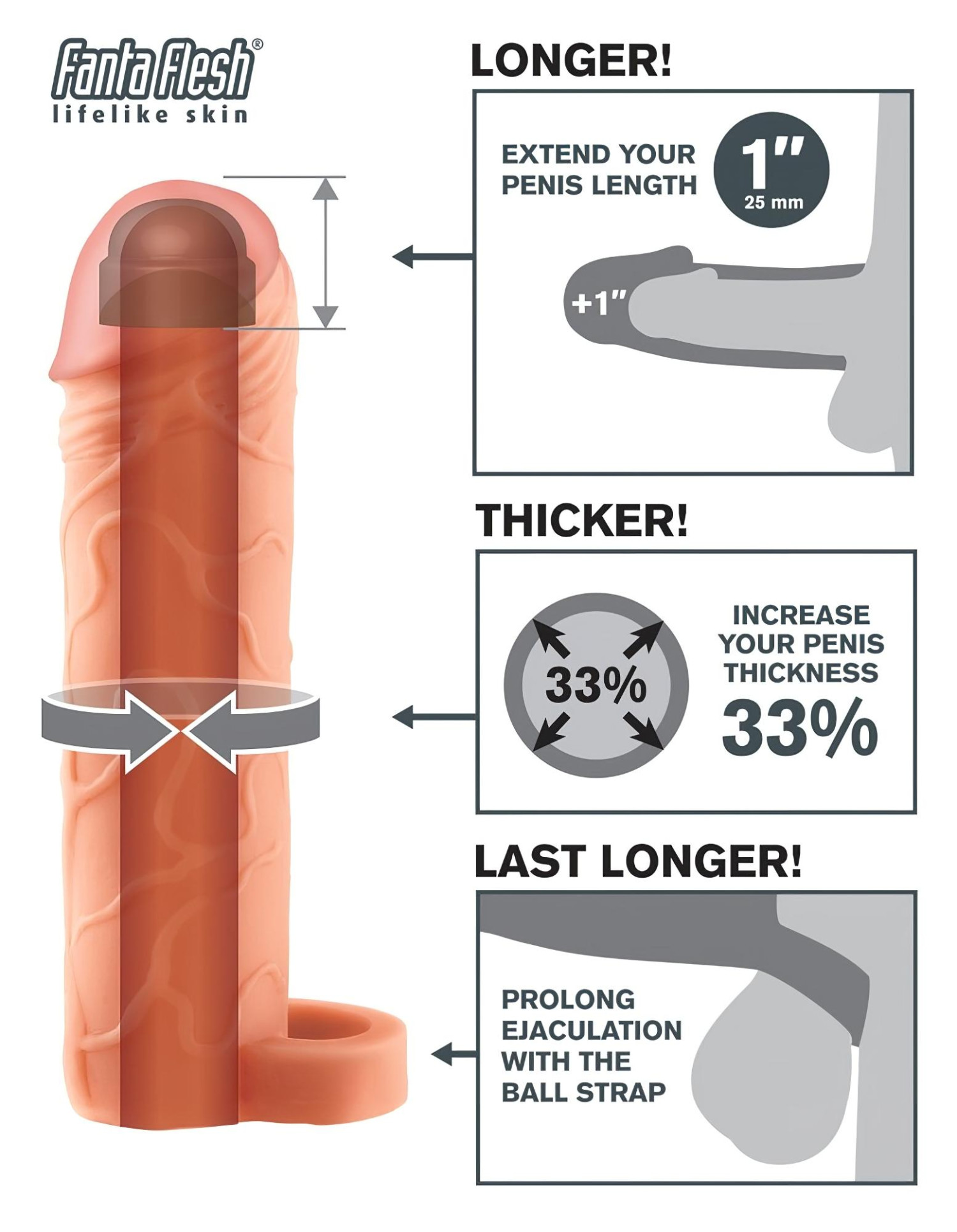 Livaktig penisforlengelse i realistisk materiale med sikker ballstropp, som smertefritt øker penisstørrelsen uten å skli av!