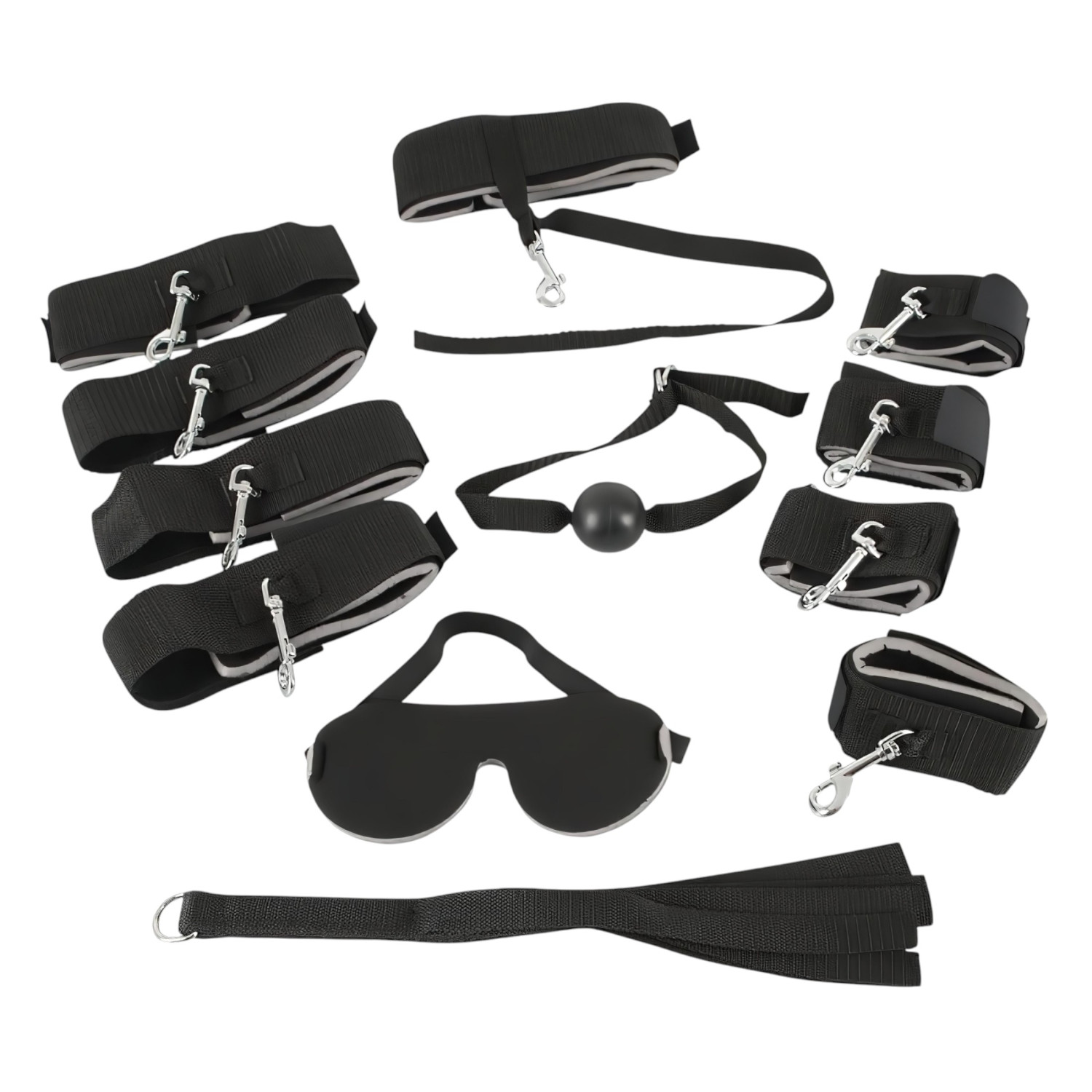 Brett ut den polstrede liggeflaten og plasser den på sengen, gulvet eller en annen stabil overflate. De 9 metalld-ringene gir mulighet til å feste hånd- og fotstropper, halsbånd og bånd i ønsket posisjon. Med den medfølgende pisken kan du ytterligere intensivere leken. Alle settets deler kan varieres etter fantasien – kun fantasien setter grenser!