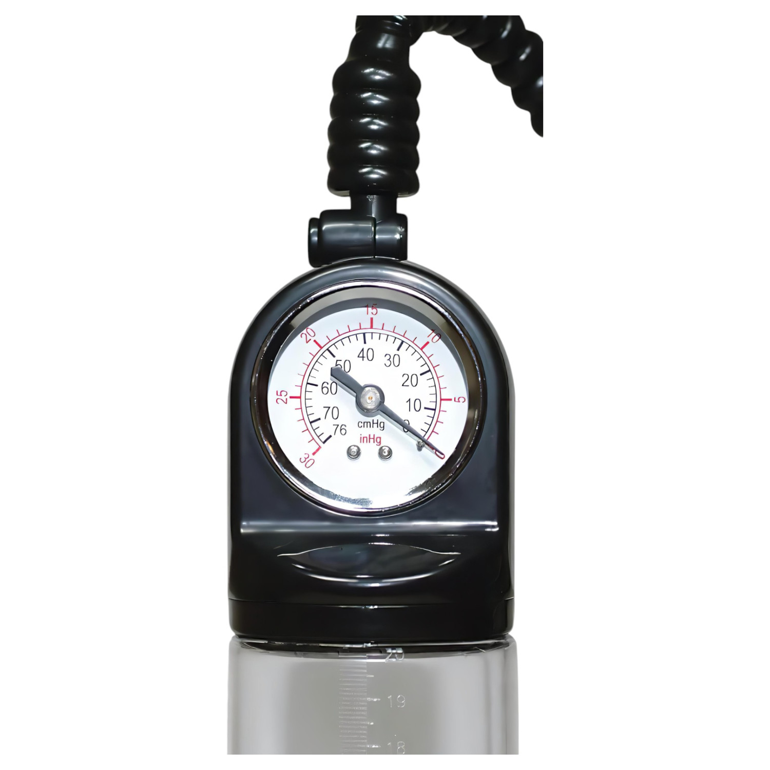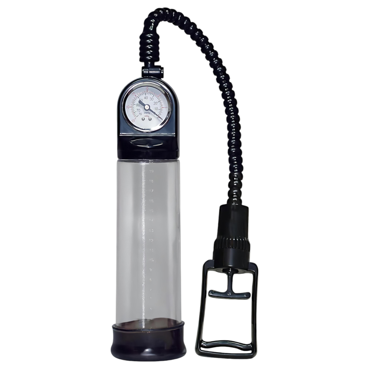 • Gjennomsiktig vakuumsylinder - du kan se penis svulme opp og måle den med skalaen på siden