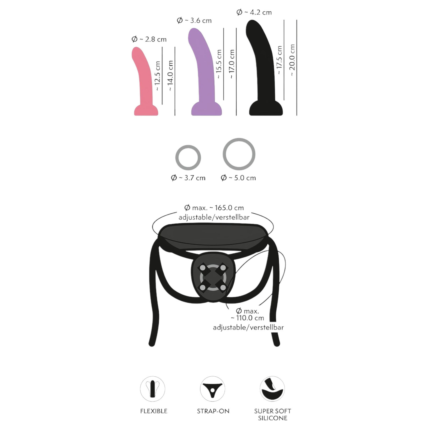 • Materiale: Flytende silikon (dildoer), tekstil (stropp)