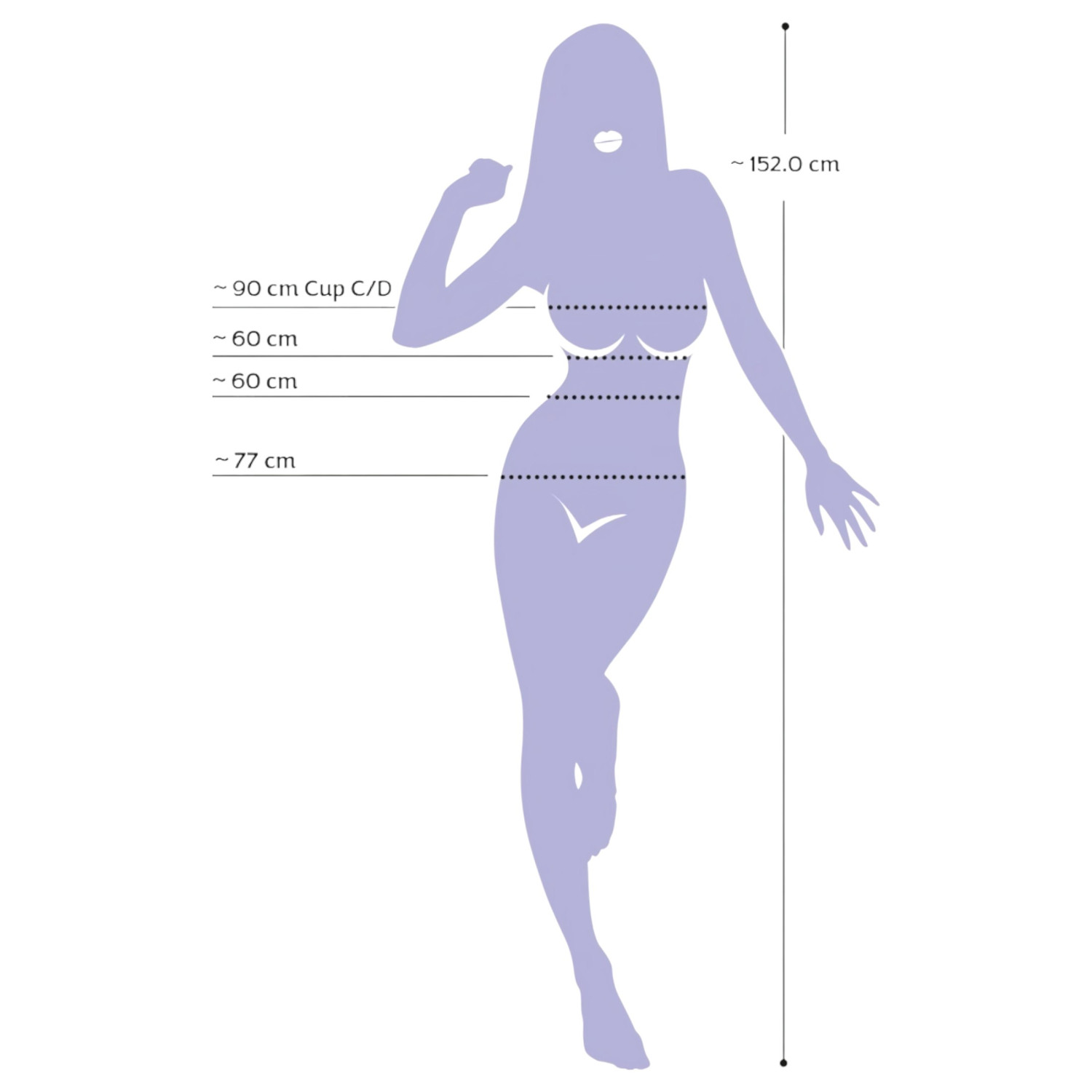• Skuldre: 90 cm, Midje: 60 cm, Hofter: 77 cm