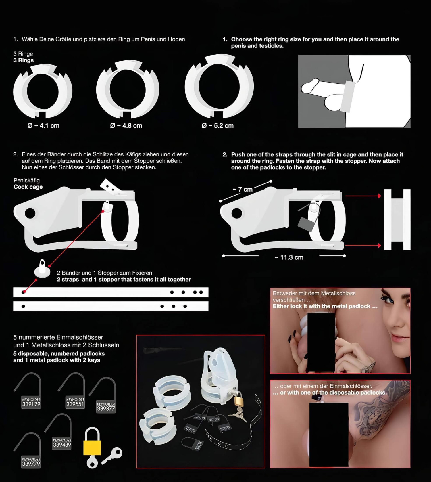 Velg riktig størrelse på testikkelringen og trekk den opp til roten av penis og testiklene. Plasser deretter silikonløkken gjennom burets stropper, og plasser penis i buret. Tre løkken gjennom de langsgående stroppene, trekk den opp til testiklene, og sett inn låsetappen. Lås tappen med den medfølgende låsen eller en plombe, slik at den holder seg på plass.