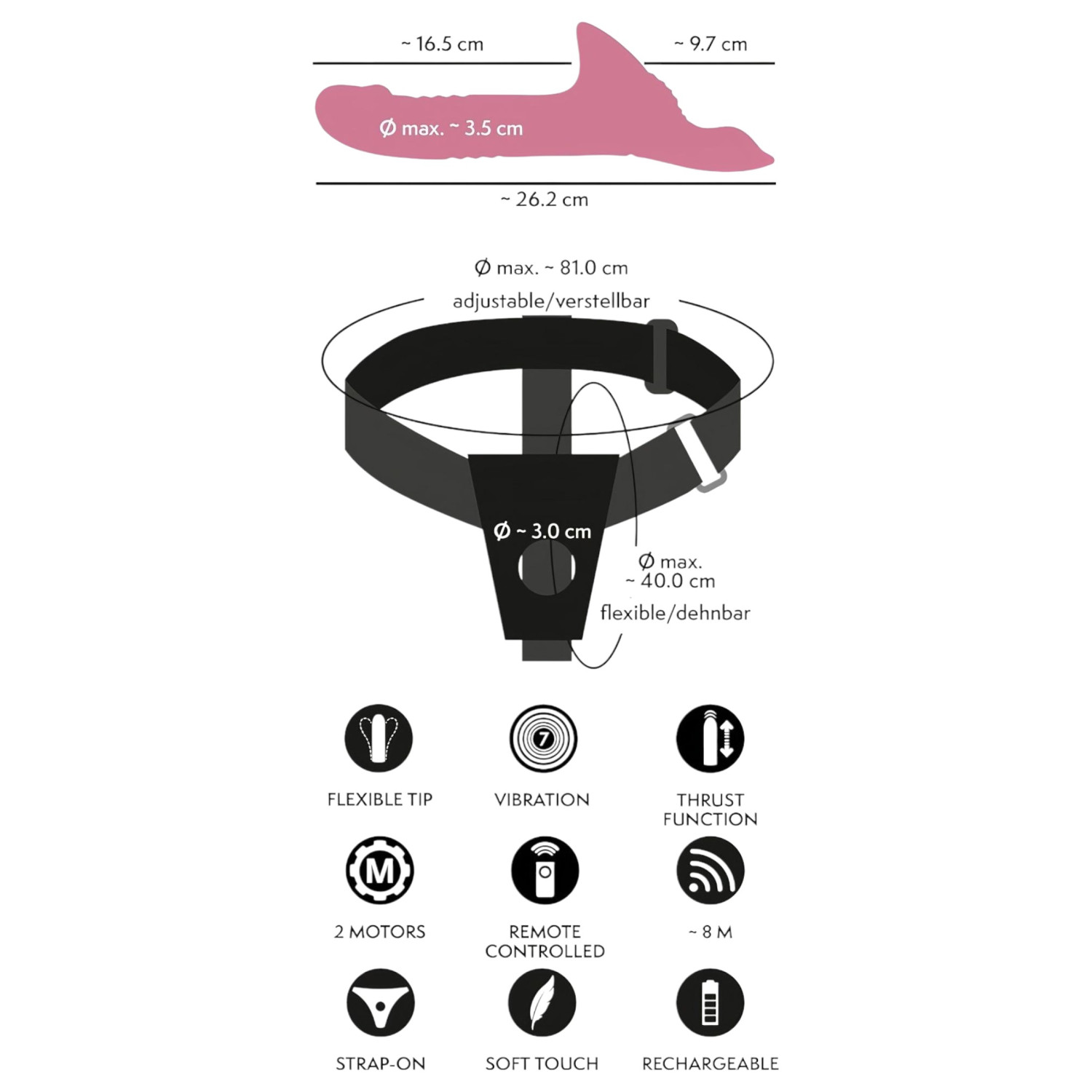 Dette 3-delte strap-on-settet inkluderer en sele, en vibrerende vibrator med to motorer og en fjernkontroll, som gir intens nytelse for begge parter.